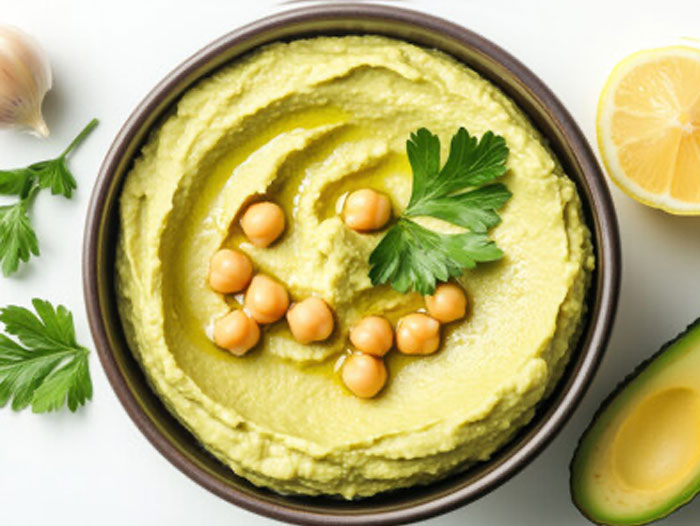 The Avocado Hummus offers a refreshing take on the traditional dip, combining ripe avocados, chickpeas, tahini, garlic, and lime juice for a velvety-smooth, vibrant flavor that pairs effortlessly with pita, veggies, or chips.
