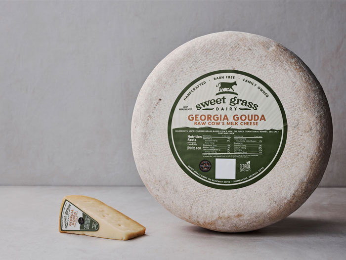 - Georgia Gouda: This reinvented exquisite cheese embodies the essence of Sweet Grass Dairy’s craftsmanship. Georgia Gouda is a naturally rinded, raw cow’s milk cheese that has been aged for a minimum of 60 days. With its smooth texture, balanced flavors, and intricate aroma, it is the perfect cheese for melting. Georgia Gouda is available in a 5 oz exact weight format as well as 11 lb wheels for food service.