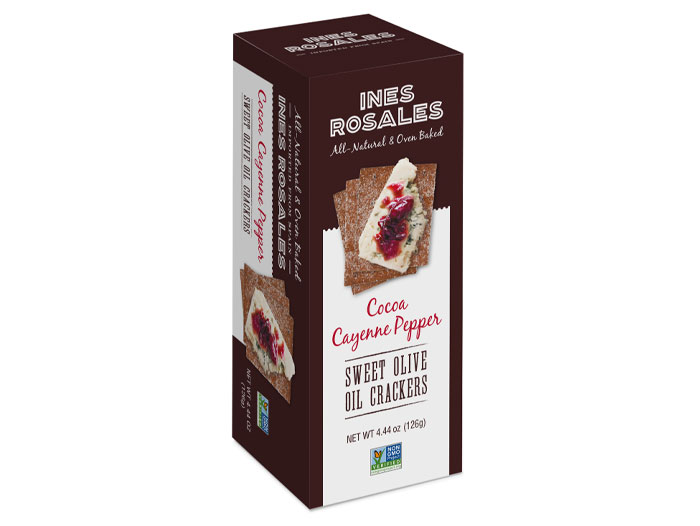 “The Cocoa Cayenne cracker has a subtle cocoa flavor with just a hint of cayenne,” said Lucia Conejo-Mir, VP of Sales North America at Ines Rosales. “A little bit sweet and a little bit spicy. With a mild heat is suitable for those whose go-to is not spicy foods. A few of my personal pairings are topping it with a flavorful blue cheese, a soft ripened brie, or dipping it in mascarpone cheese. These crackers are versatile and unique.”