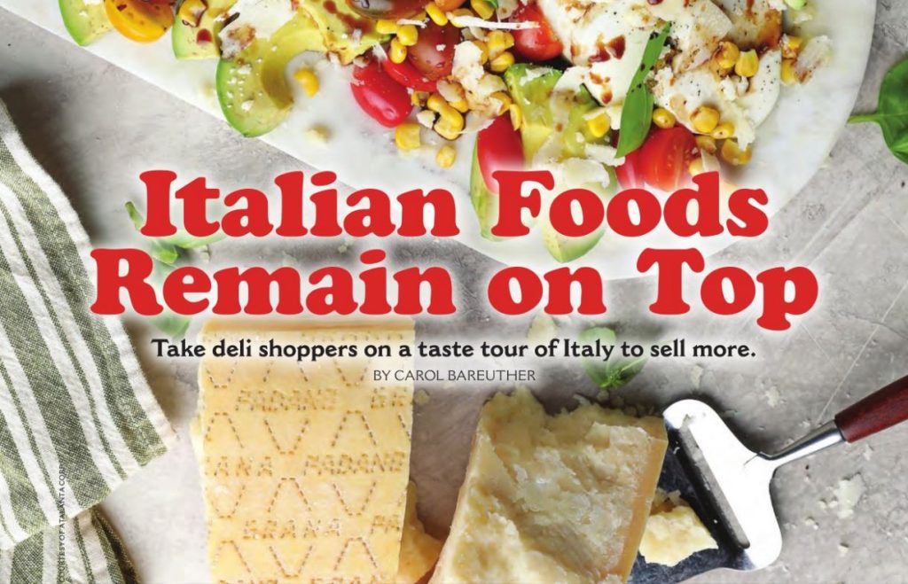 5. INCLUDE PREPARED FOODS. To build a cohesive experience, integrate Italian meats, cheeses and other items like pasta and olive oil into other parts of the store like high-demand prepared foods, suggests Atalanta’s Baldwin. “Leverage the popularity and premium association of Italian foods by crafting new recipes that drive trial of specialty foods carried in your store.”