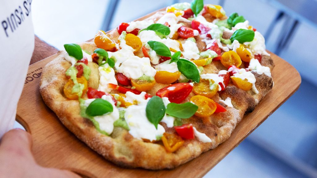 Born from the legacy of Roman baker Corrado Di Marco — whose family has been baking for three generations — Pinsa is crafted with a proprietary blend of wheat, rice, and soy flours, and leavened with a natural sourdough starter for 72 hours. The result is a crust that’s uniquely light, airy, crispy, and highly digestible. It’s also higher in protein, lower in gluten, and contains less fat, sugar, and calories than traditional pizza dough.