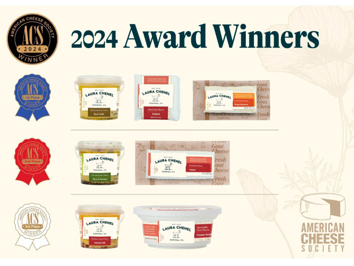 Sonoma, California — Laura Chenel, America’s trailblazing goat cheese producer, is honored to announce its recent awards recognized at the 2024 American Cheese Society Conference. The American Cheese Society (ACS) is dedicated to promoting artisan, farmstead, and specialty cheeses, and hosts North America’s annual conference showcasing the best of the cheese industry.