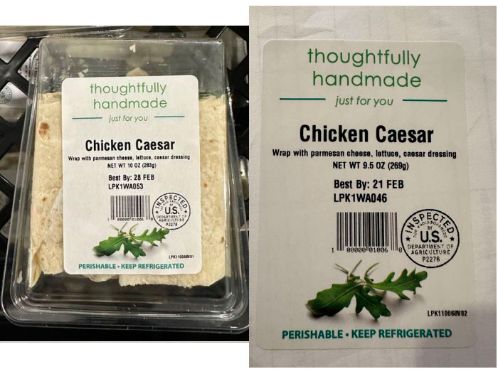 • 10-oz. clear clamshell containers containing “thoughtfully handmade just for you Chicken Caesar Wrap with parmesan cheese, lettuce, Caesar dressing” with Best By dates of 21 FEB, 23 FEB, 25 FEB, and lot codes LPK1WA046, LPK1WA048, LPK1WA050 printed on the label.