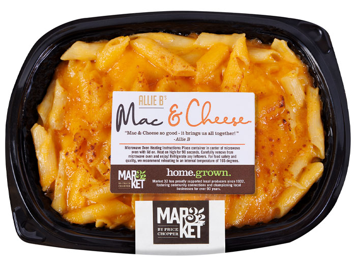 The premium new product—made with hand-cracked eggs, choice cheeses, and other fine ingredients—marks a first-of-its-kind collaboration for Market 32/Price Chopper. Each container of Allie B’s Mac & Cheese displays both the Market 32/Price Chopper and Allie B’s Cozy Kitchen logos, becoming the first Foodfare item to join the company’s home.grown. initiative, which features the finest and freshest products from local producers and growers.