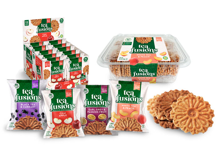 The exciting new TeaFusions Waffle Cookies are ideal for grocery front of store and lunchbox departments, delis and convenience stores. The products are available in individual single-serve 80-calorie packets, 12-count multipack boxes, and in-store bakery containers. For food service, packets come in 72-count and 180-count bulk cases, perfect for corporate cafeterias, breakrooms, universities, travel/hospitality, and health and fitness facilities.