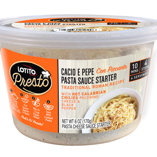 Norseland, Inc., Darien, CT, introduced two new shelf-sta-ble products as part of the Lotito Presto Cacio e Pepe Pasta Sauce Starter line, in Original and Black Truffle. Just add hot pasta water, and it creates a classic Roman dish with a perfectly smooth sauce that customers can prepare in minutes with almost no effort. Available refrigerated and shelf-stable for added convenience.