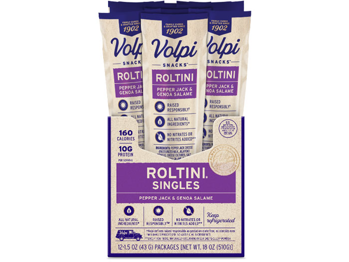Ideal for busy lifestyles, Volpi’s Pepper Jack and Genoa Salame Roltini Singles are individually wrapped for freshness and convenience, making them the perfect on-the-go snack.